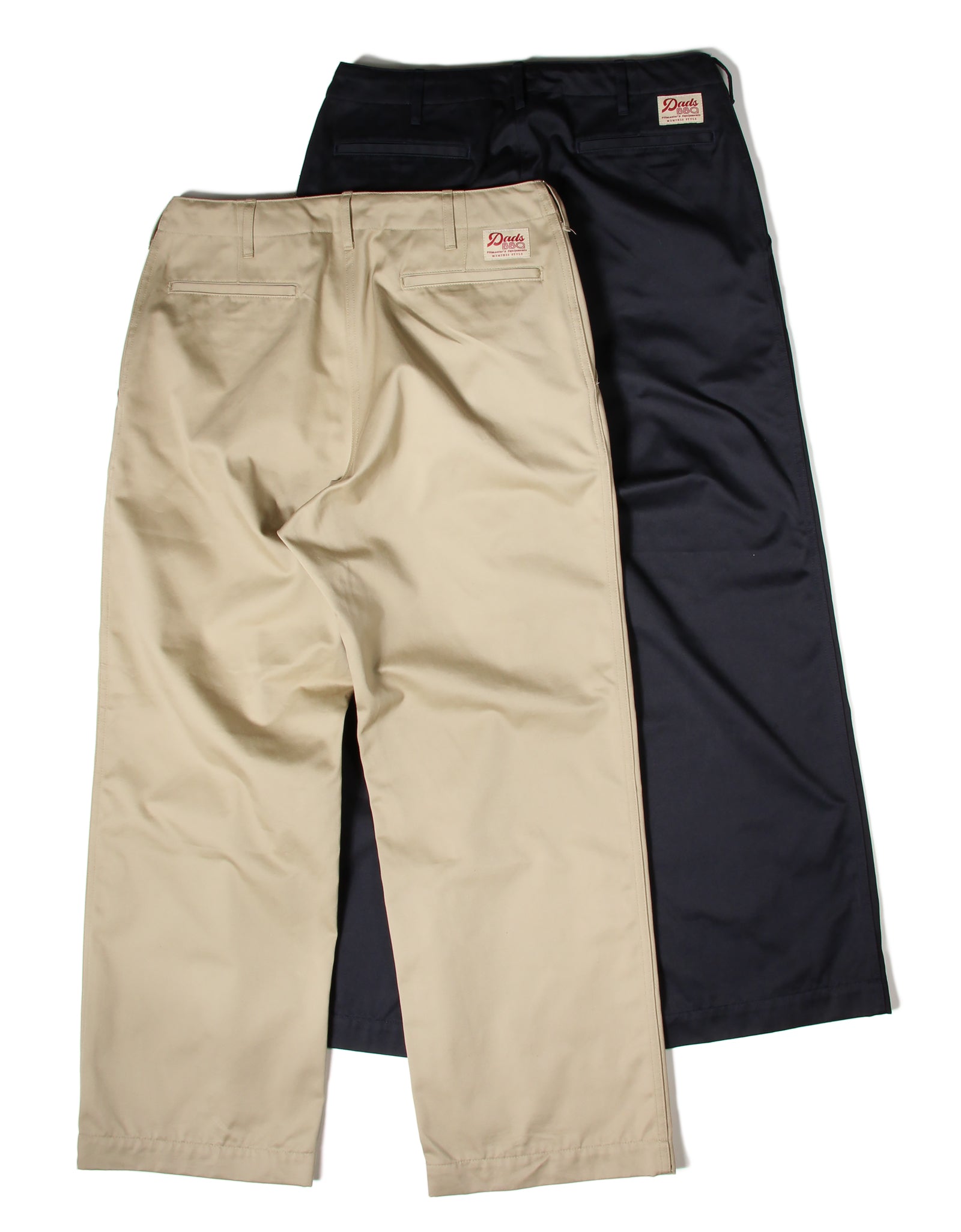 BBQグリルの前で豪快にブロック肉を焼き上げるアメリカの親父。そんなワイルドな姿をイメージしたルーズシルエットのチノトラウザーです。深めの股上とゆったりとしたワイドシルエットの無骨な一本。