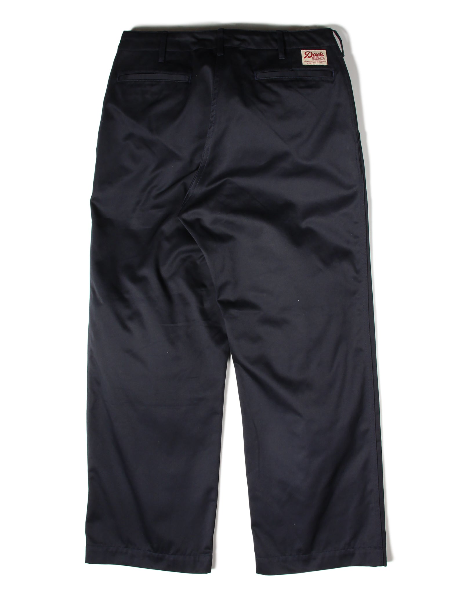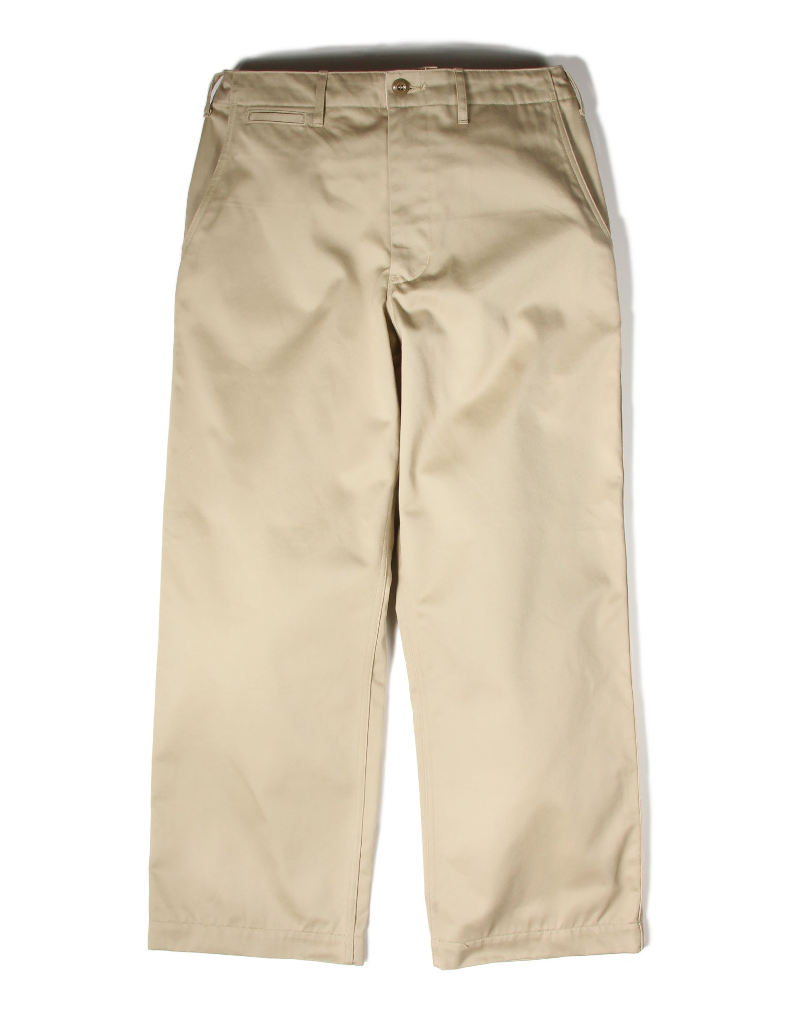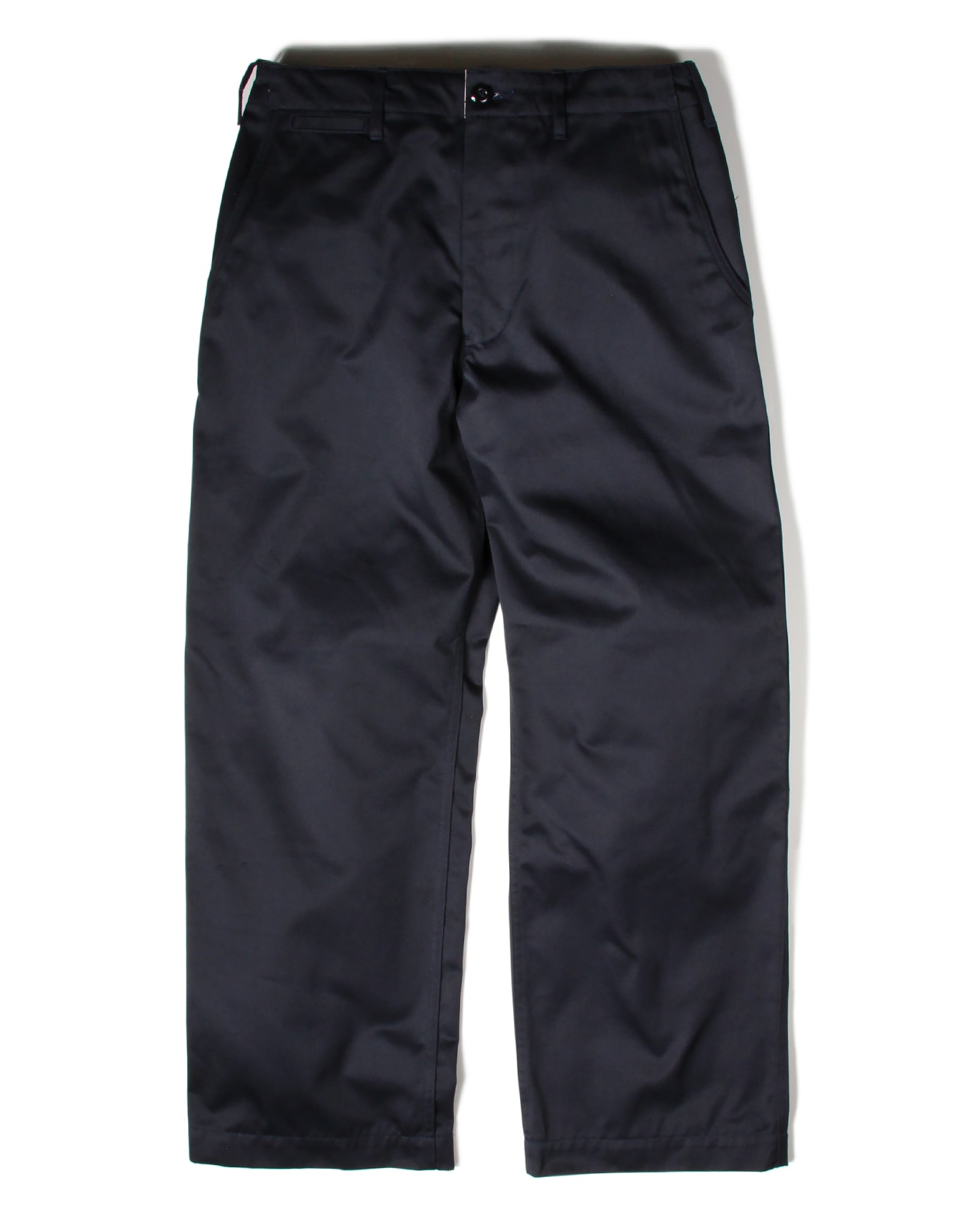 耐久性に優れたT/C素材を採用し、深めの股上とワイドなレッグラインが特徴。がっしりとした佇まいながらも、程よいハリと軽快な穿き心地、コットンライクな質感を兼ね備えています。