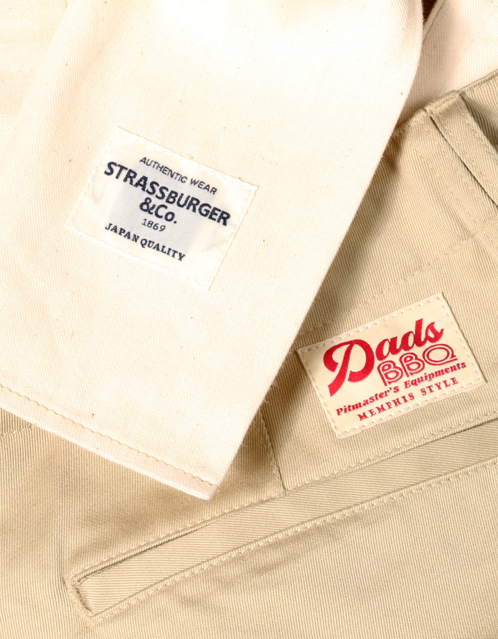 肉を焼く熱気や煙にも負けないタフな存在感は、アウトドアシーンからデイリーユースまで幅広く活躍。クラシカルなチノの表情に『Dads BBQ』らしい無骨な解釈を加えた、アメリカンカルチャーを感じさせる一本に仕上がっています。