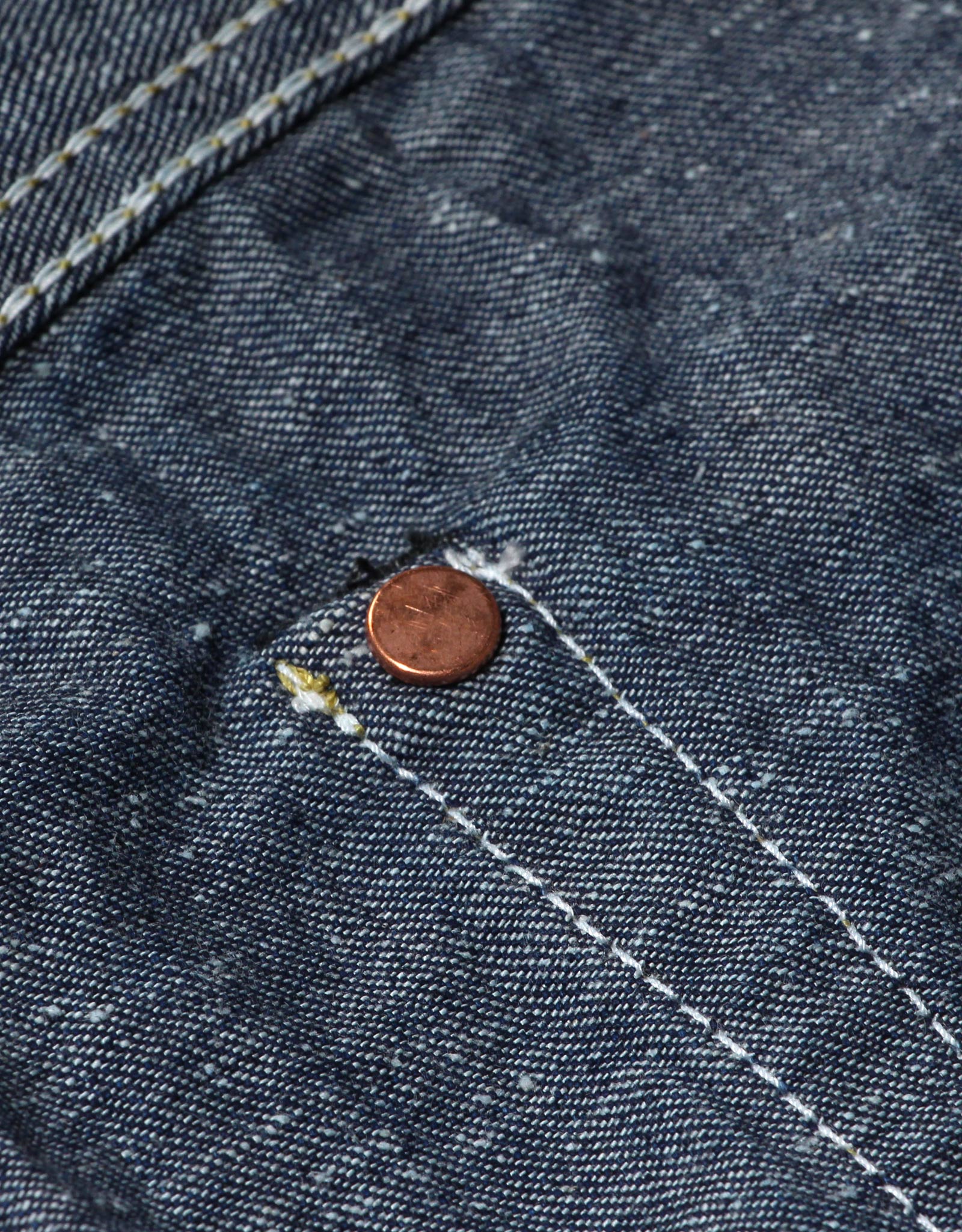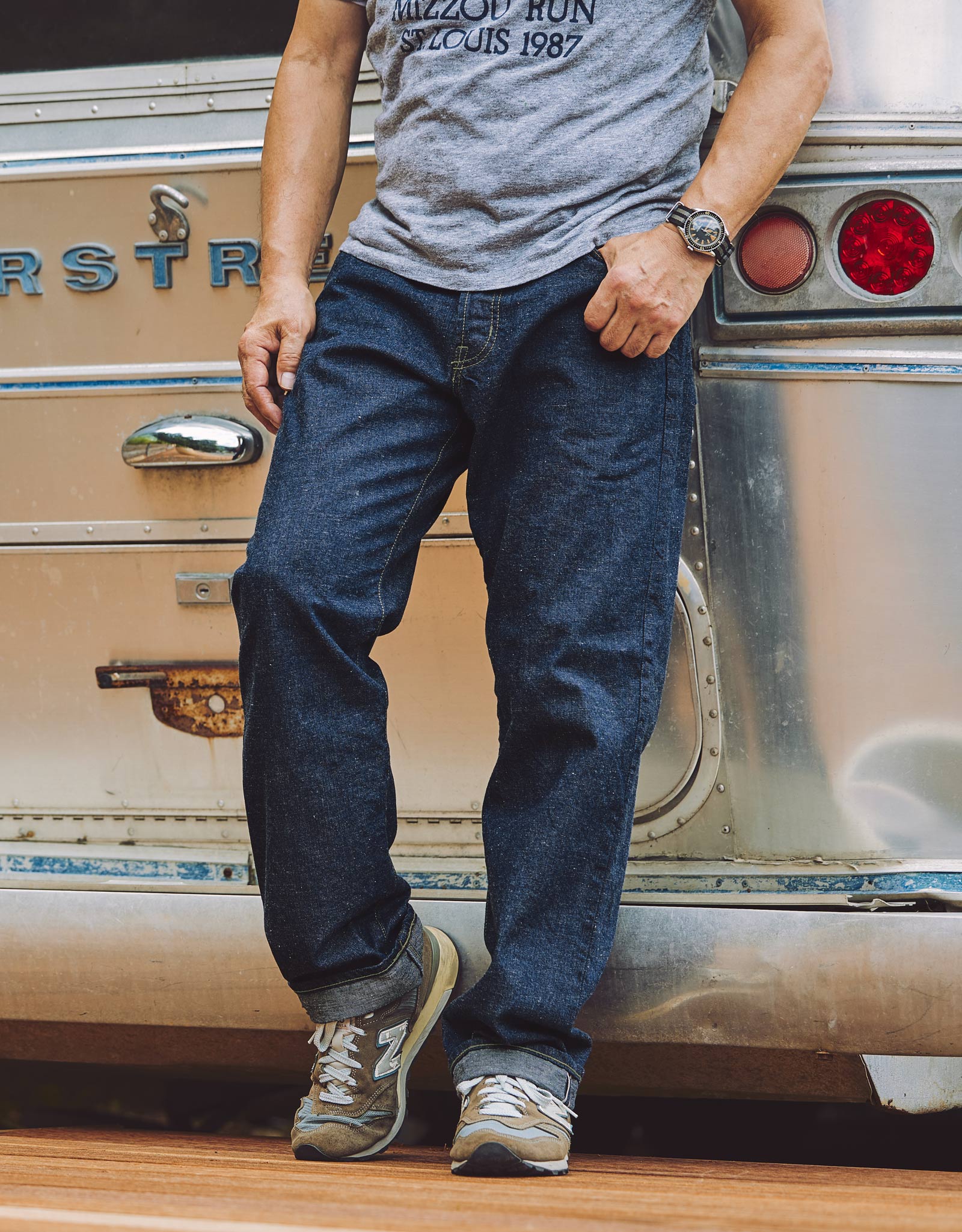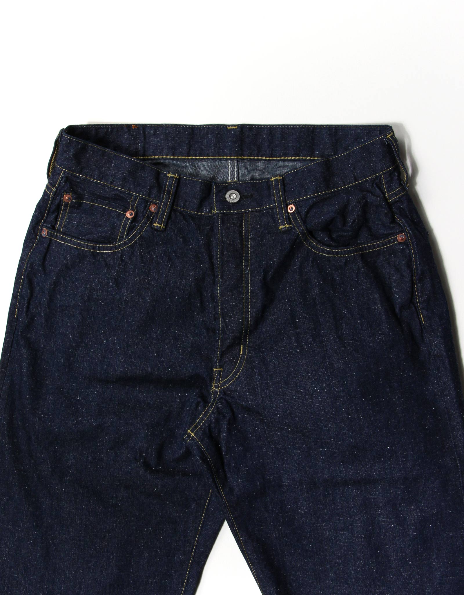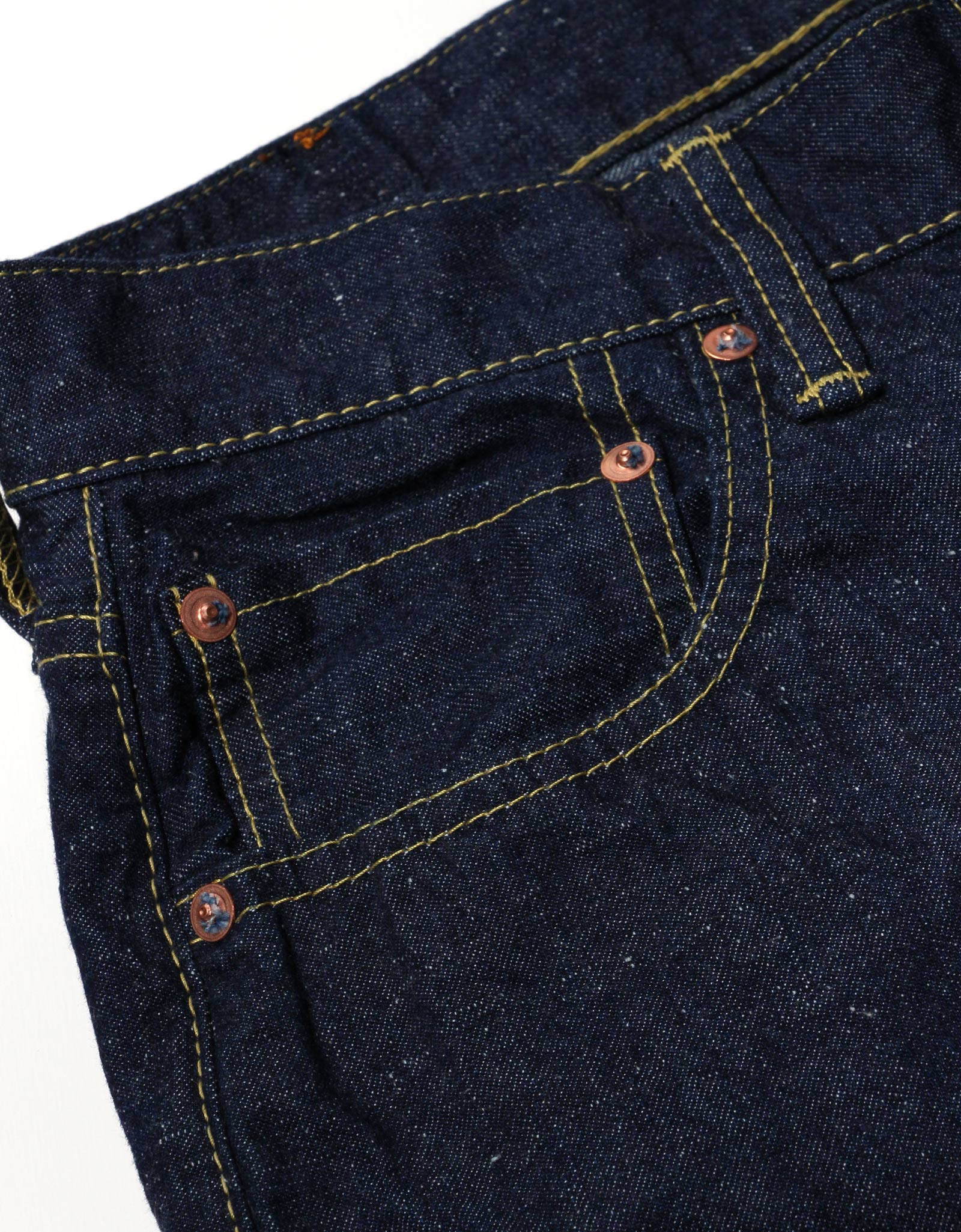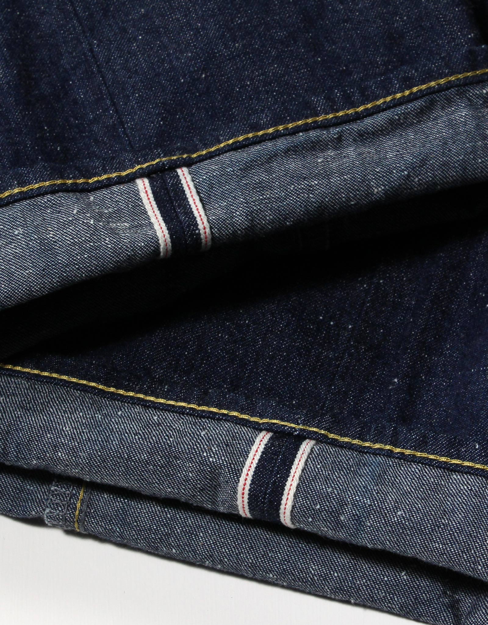 経糸にJUMBO7番、緯糸にナチュラルネップを使用したオリジナルファブリック『SMALL LUMP SELVEDGE』12ozデニムのストレートジーンズ。