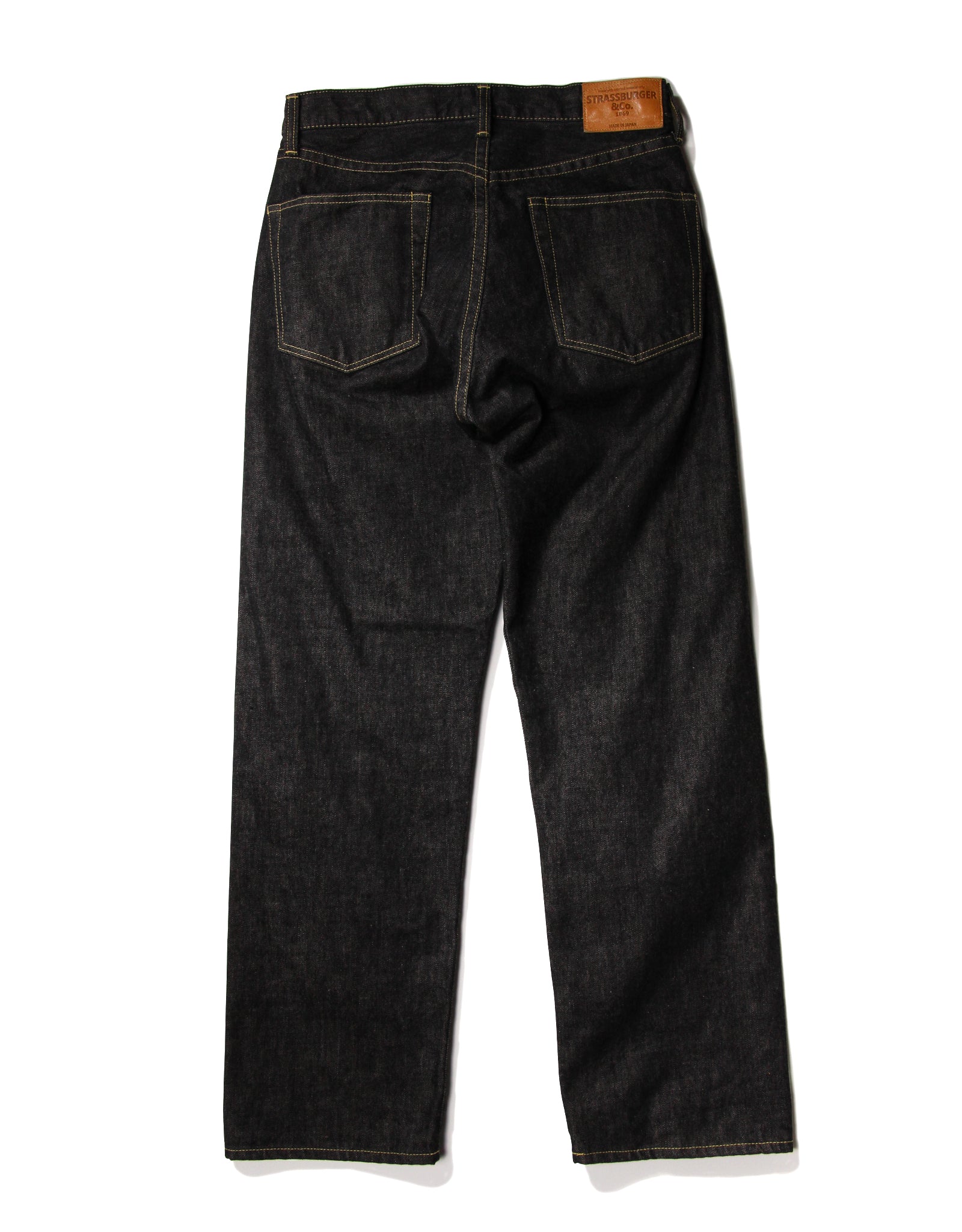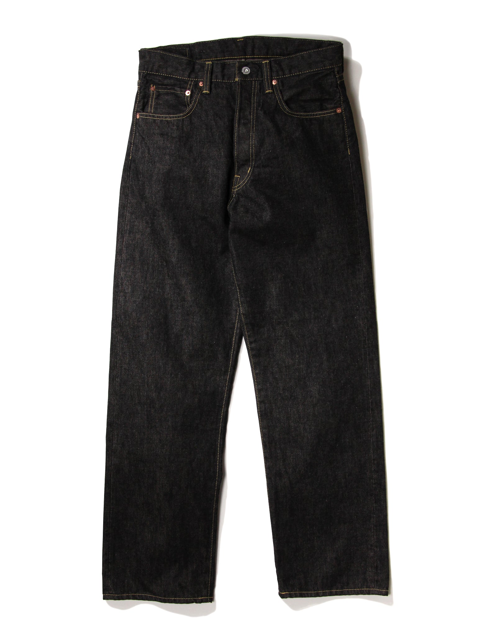 緯糸に茶綿を使用し奥行きのある色落ちを生む定番デニム『JUMBO』シリーズのブラックデニムバージョン。縫製にはバナナイエローのコアヤーンを用い、ボタンフライ、V字ステッチなどヴィンテージ仕様のストレートジーンズです。