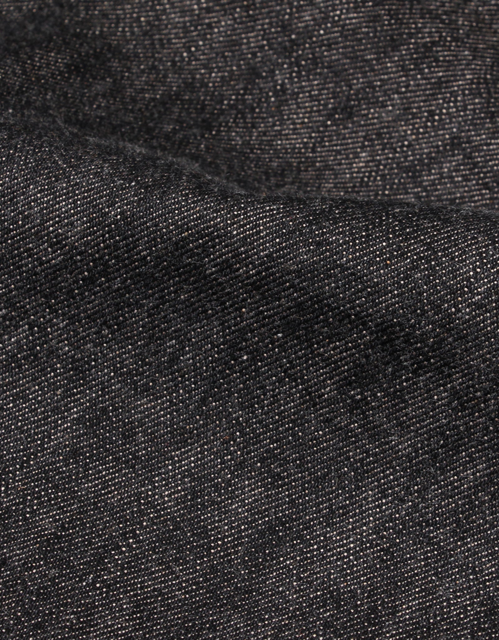 緯糸に茶色の綿を使用した14.5oz JUMBO DENIMのブラックバージョンを使用。旧式力織機を使用し、茶綿の緯糸を用いることで、当時のムラ感や土っぽさ、粗野でざらつきのある質感を持ったデニムを体感いただけます。